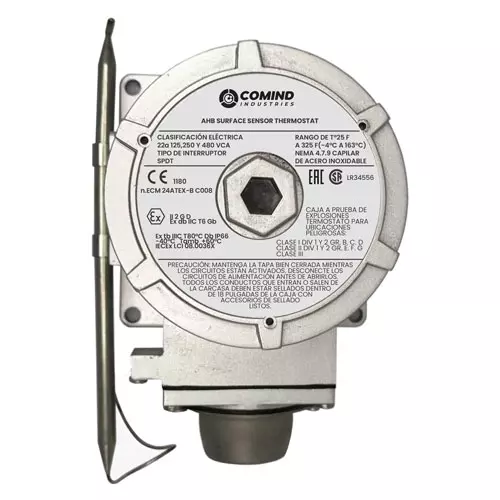 Este termostato de superficie con certificación EEx d proporciona control de temperatura para todos los cables calefactores en zonas peligrosas. El rango de temperatura de conmutación va de –4 °C a +163 °C y se ajusta externamente a la carcasa Ex mediante un dial montado bajo una tapa y un sello atornillados.